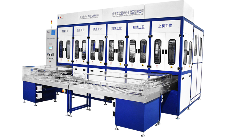 該設備有上下料網帶、超聲波清洗工位、噴淋漂洗工位、高壓風切、熱風烘干工位、溫控水加熱系統(tǒng)、風機、溫控空氣加熱系統(tǒng)、移動式風刀、PLC+觸摸屏控制系統(tǒng)、管路系統(tǒng)及智能電器控制系統(tǒng)等組成。自動進排液和自動